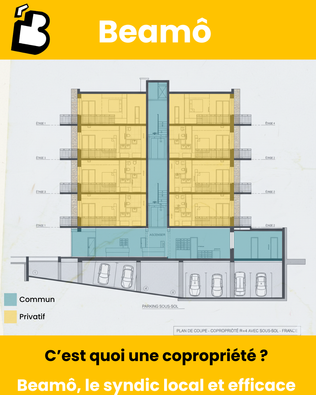Imaginons, vous êtes copropriétaires dans une copropriété avec un parking sous-sol, et 4 étages au-dessus desservis par un ascenseur.