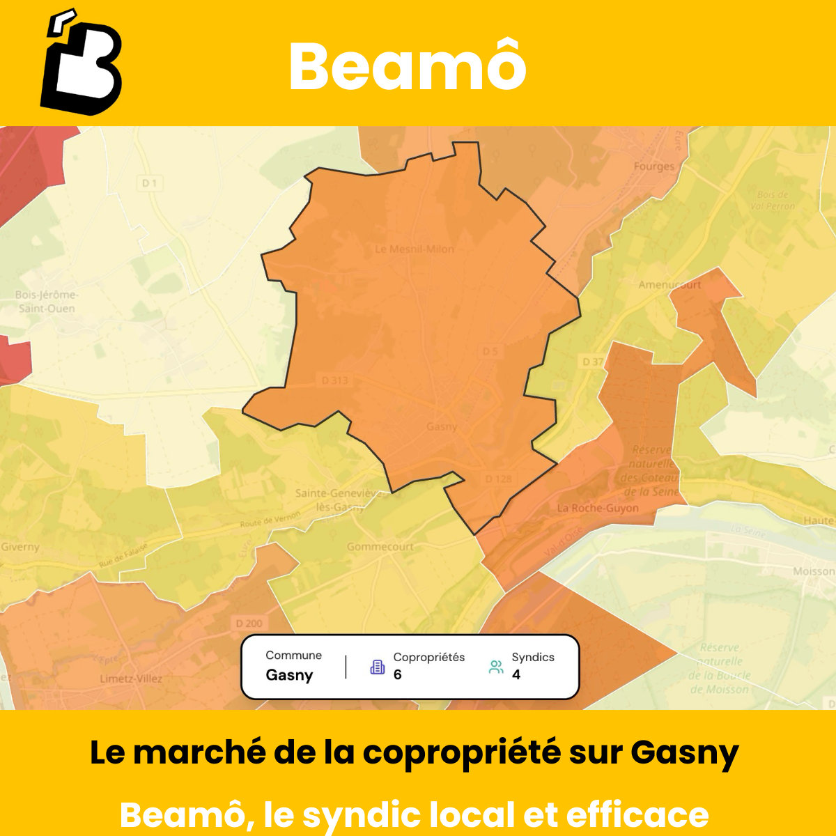 La copropriété moyenne à Gasny serait constituée de 49 lots, construite avant 1994 (donc soumise aux diagnostics Plomb, Amiante...) et serait gérée par un syndic professionnel national (aucune copropriété en autogestion déclarée).